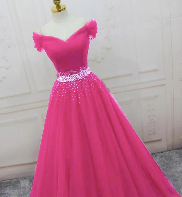 Vestido de fiesta largo de tul con cinturón de cuentas y hombros descubiertos en color burdeos o rosa brillante