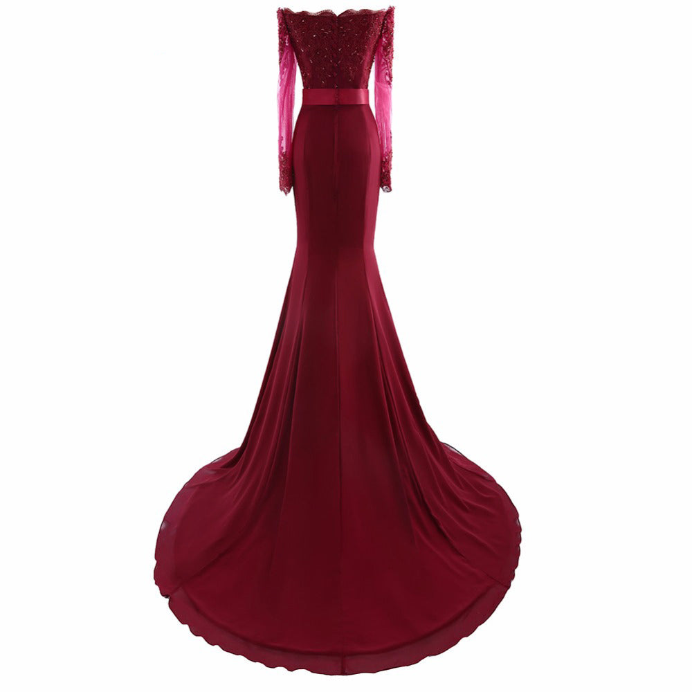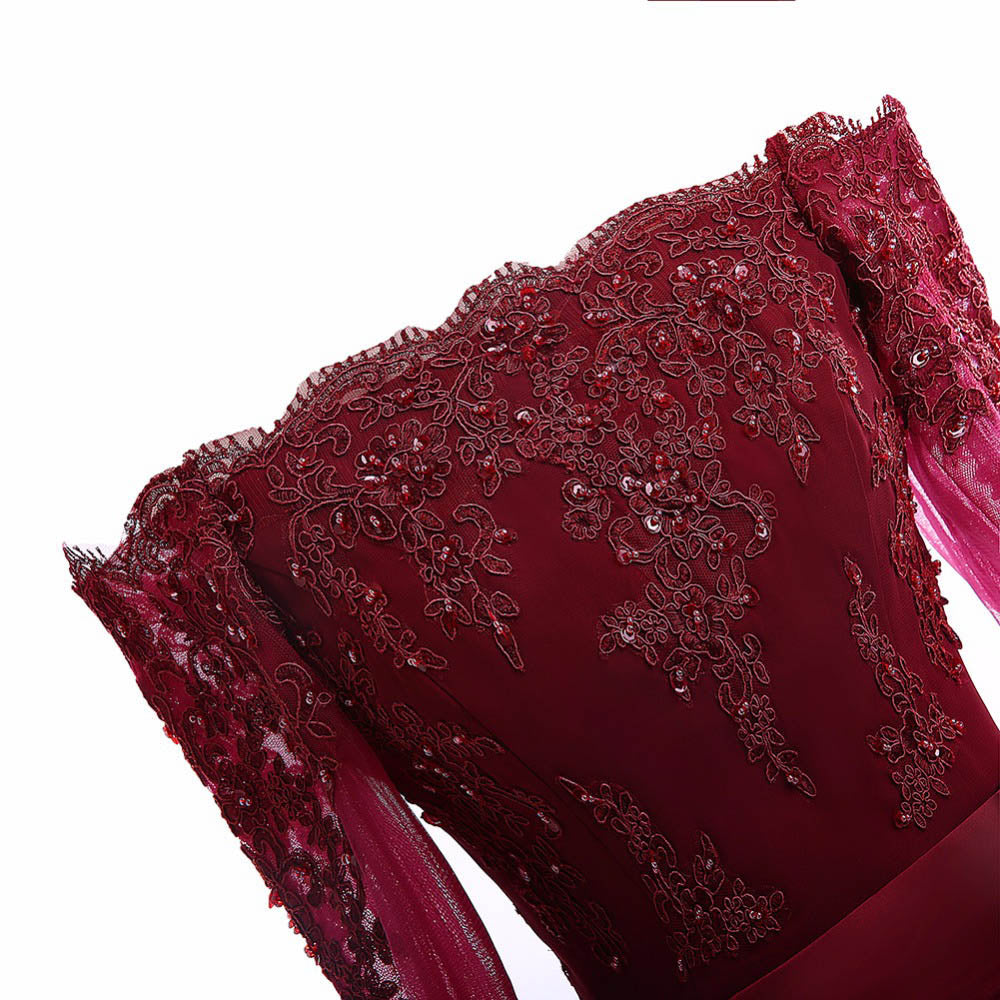 Vestido de dama de honor de manga larga color burdeos con adornos de encaje para mujer, vestido formal de fiesta de noche LP6621