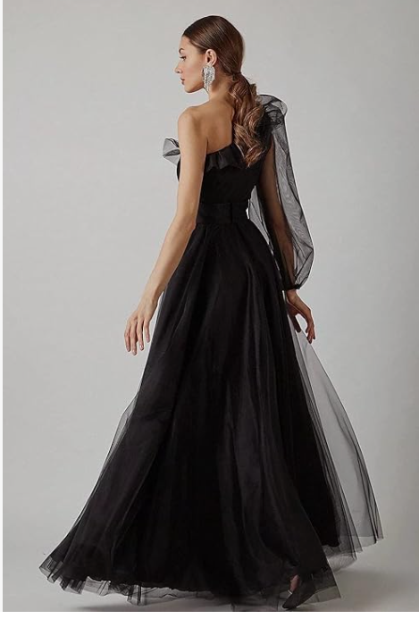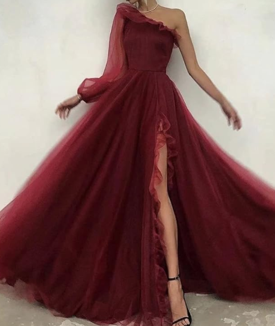 Burgundy Mesh One Sleeves Prom Dress PL5312