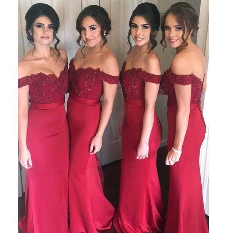 Vestido de dama de honor de color burdeos con hombros descubiertos para mujer, vestido de fiesta de sirena con encaje y hombros descubiertos
