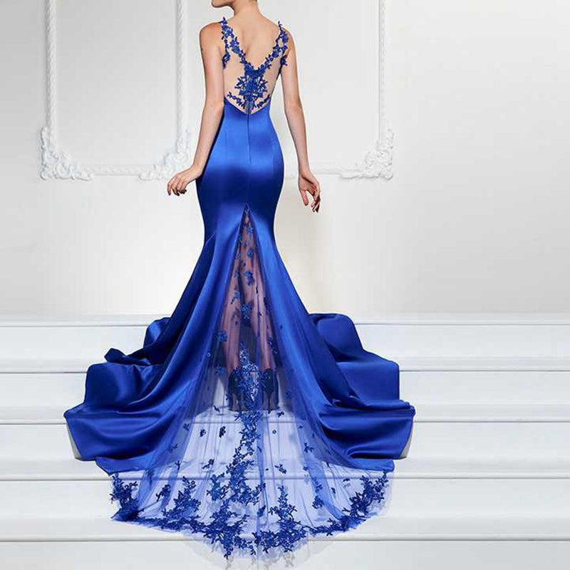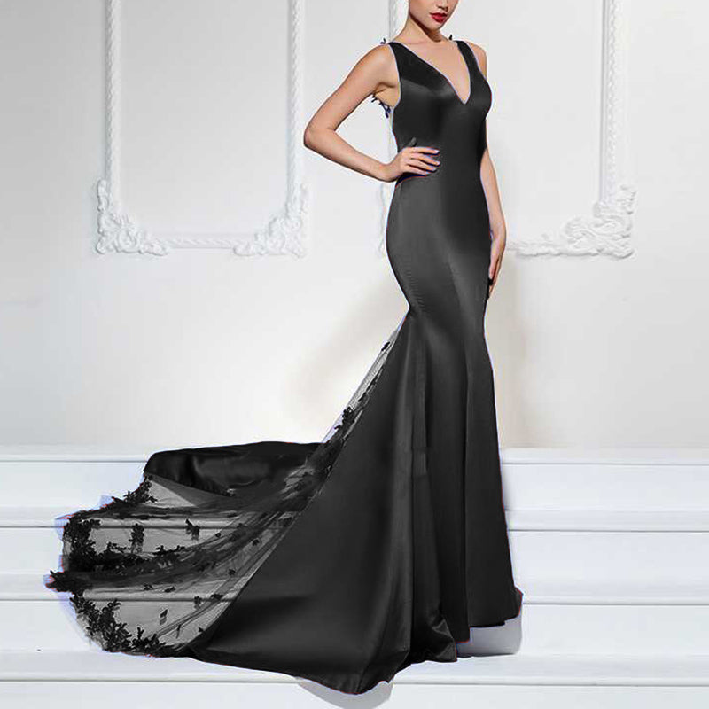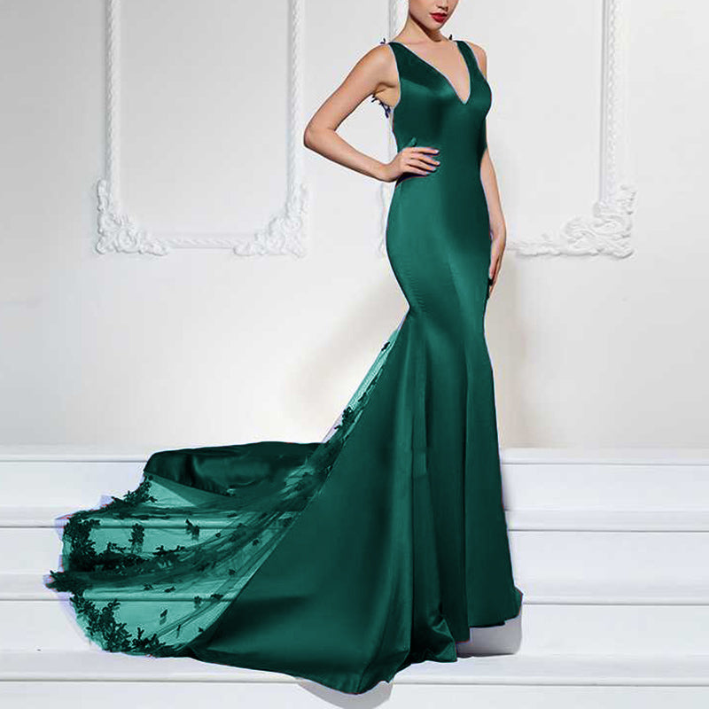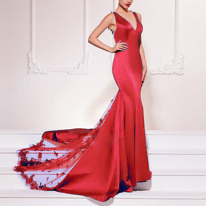 Vestido de fiesta de sirena con escote en V y apliques de encaje satinado color burdeos para mujer, vestidos formales de noche largos