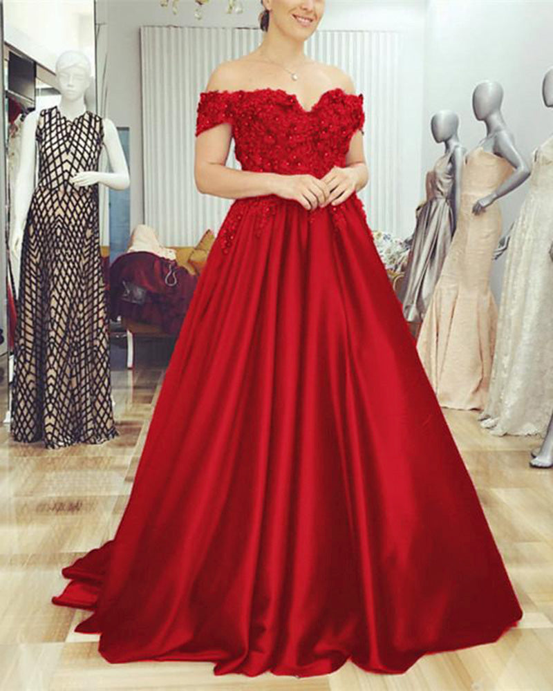 Vestido de novia burdeos de satén con hombros descubiertos y flores de encaje LP6632