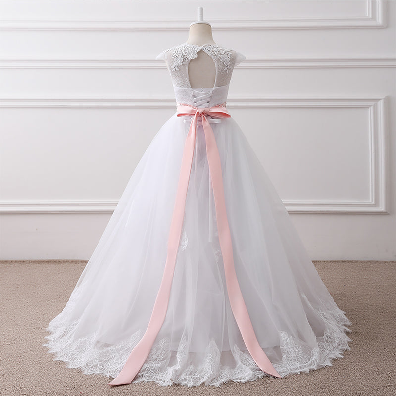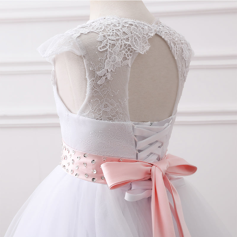 Vestido de fiesta de encaje con mangas cortas para niña de las flores, vestido blanco para bebé con cinturón rosa, vestido de primera comunión para niños