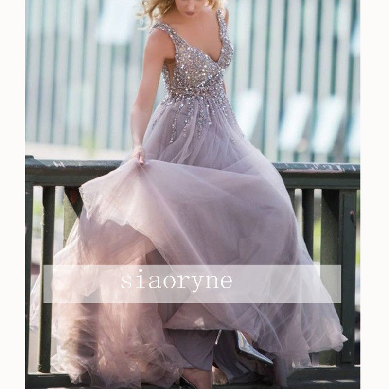 Vestido de noche largo formal con escote en V y cuentas de cristal con ilusión y carismático 2020 con abertura en la pierna