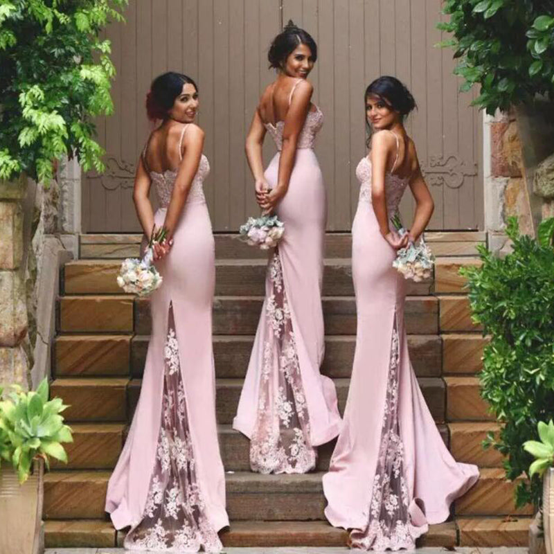 Elegantes vestidos de dama de honor de encaje rosa, largos, sirena, tirantes finos, espalda descubierta, vestidos de dama de honor para fiesta de boda, hechos a medida LP623