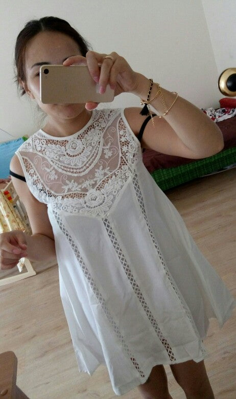 Vestido de verano blanco elegante, informal, de verano, primavera y otoño, para playa, con encaje, sin mangas, 2020