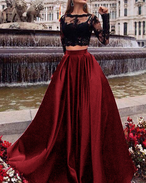 Vestido de fiesta largo de dos piezas con top corto y apliques de encaje con mangas largas