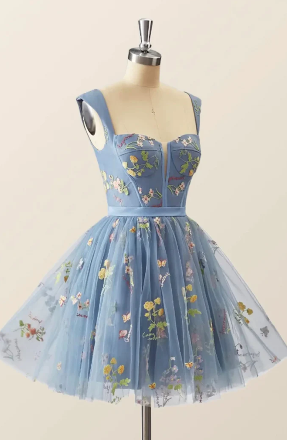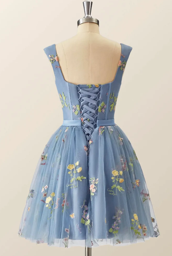 Lindo vestido corto azul para fiesta de graduación, vestido floral para fiesta de bienvenida SP10164