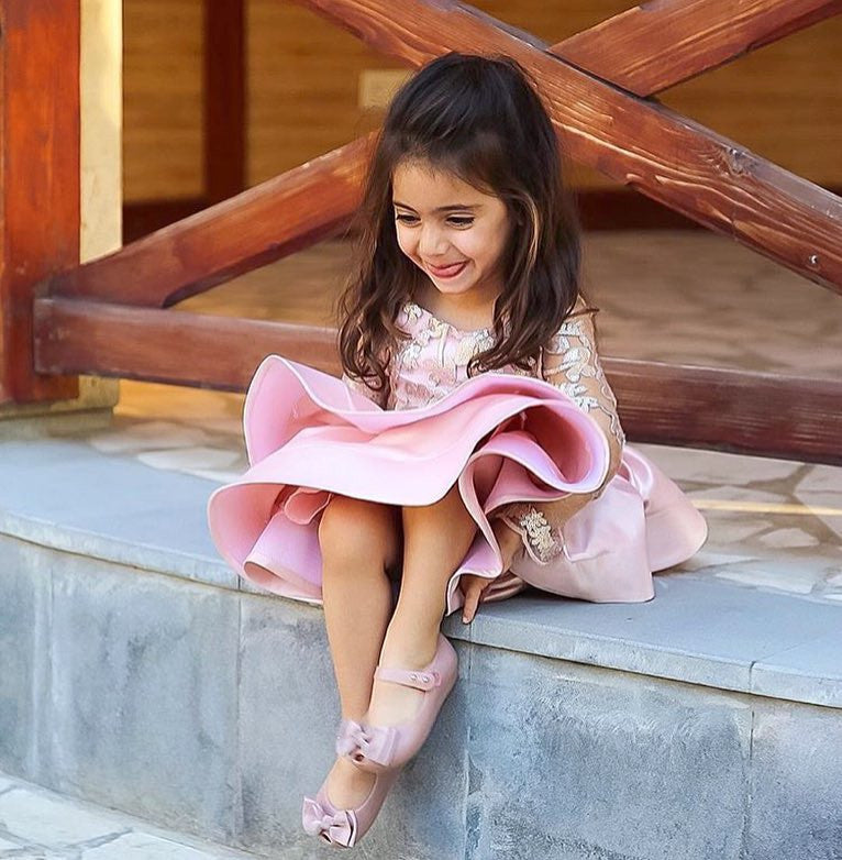 Bonitos vestidos cortos de satén rosa para desfile de niñas, falda cansada, vestidos de primera comunicación con lazo