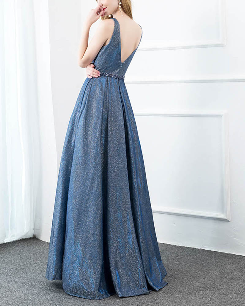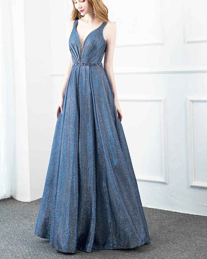 Elegantes vestidos de fiesta de satén con escote en V y línea A en color azul con cinturón de cristal, vestidos de noche largos 20202