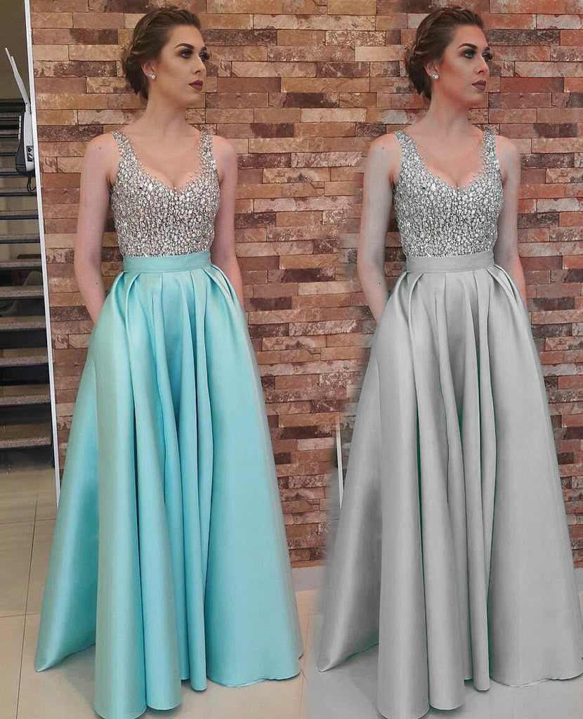 Elegantes vestidos de fiesta de satén largos en línea A de color azul plateado con cuentas, vestidos formales de noche para mujer