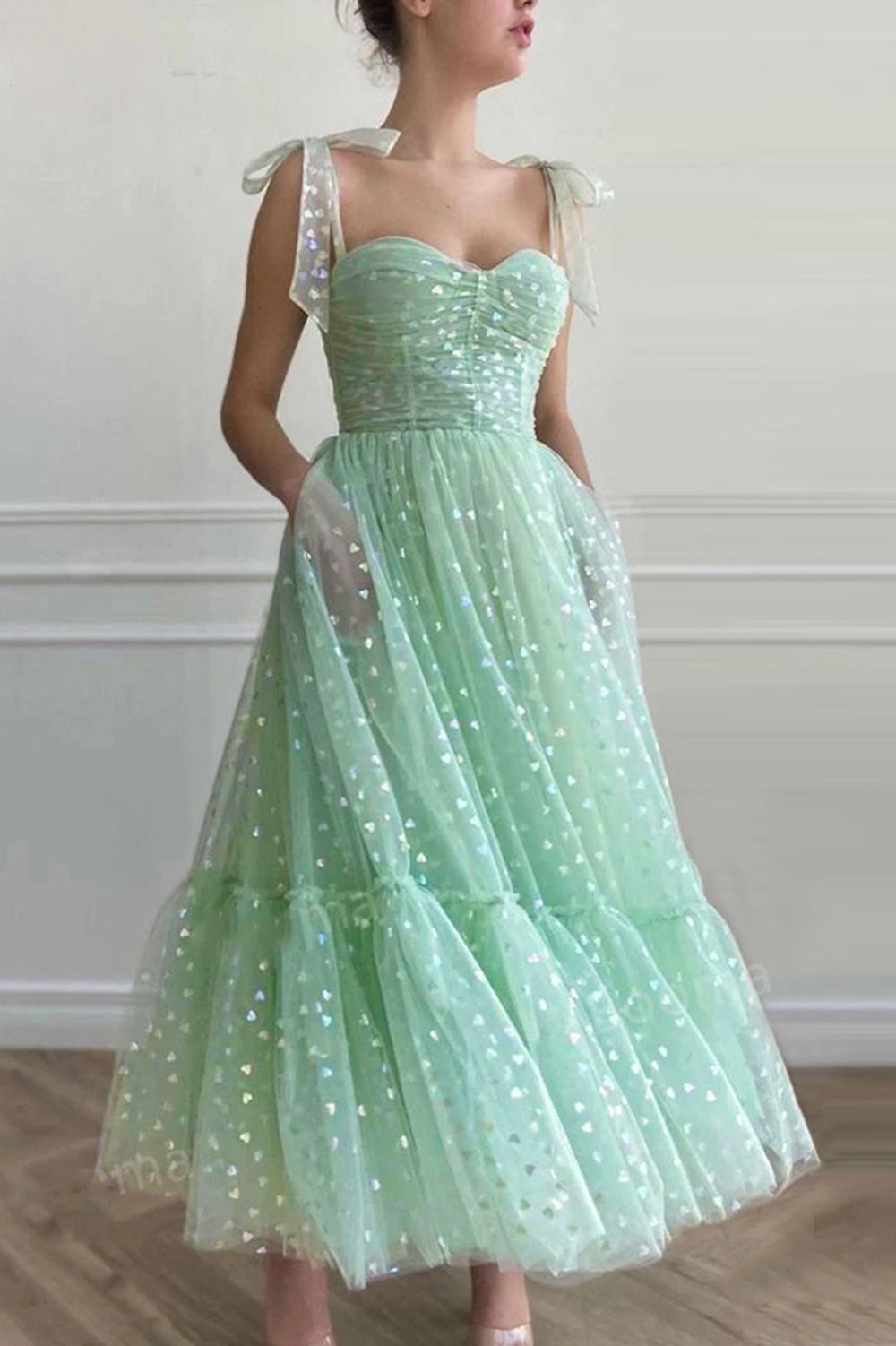 Elegante vestido de fiesta de cóctel con tirantes finos de tul color verde menta y largo hasta el suelo con corazones color melocotón