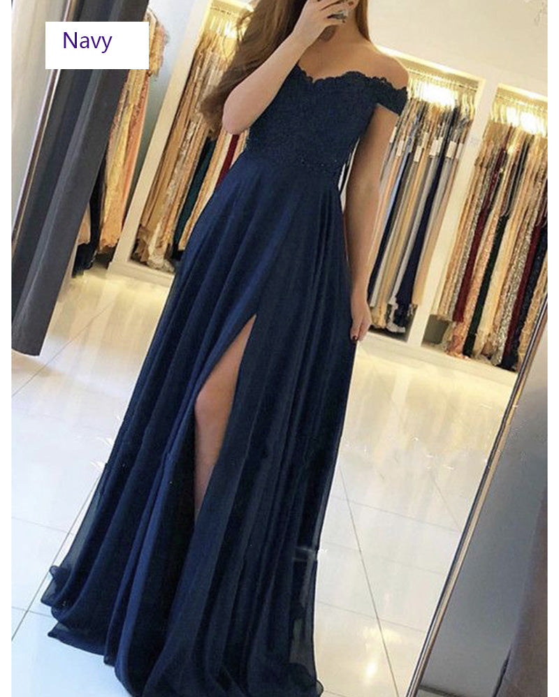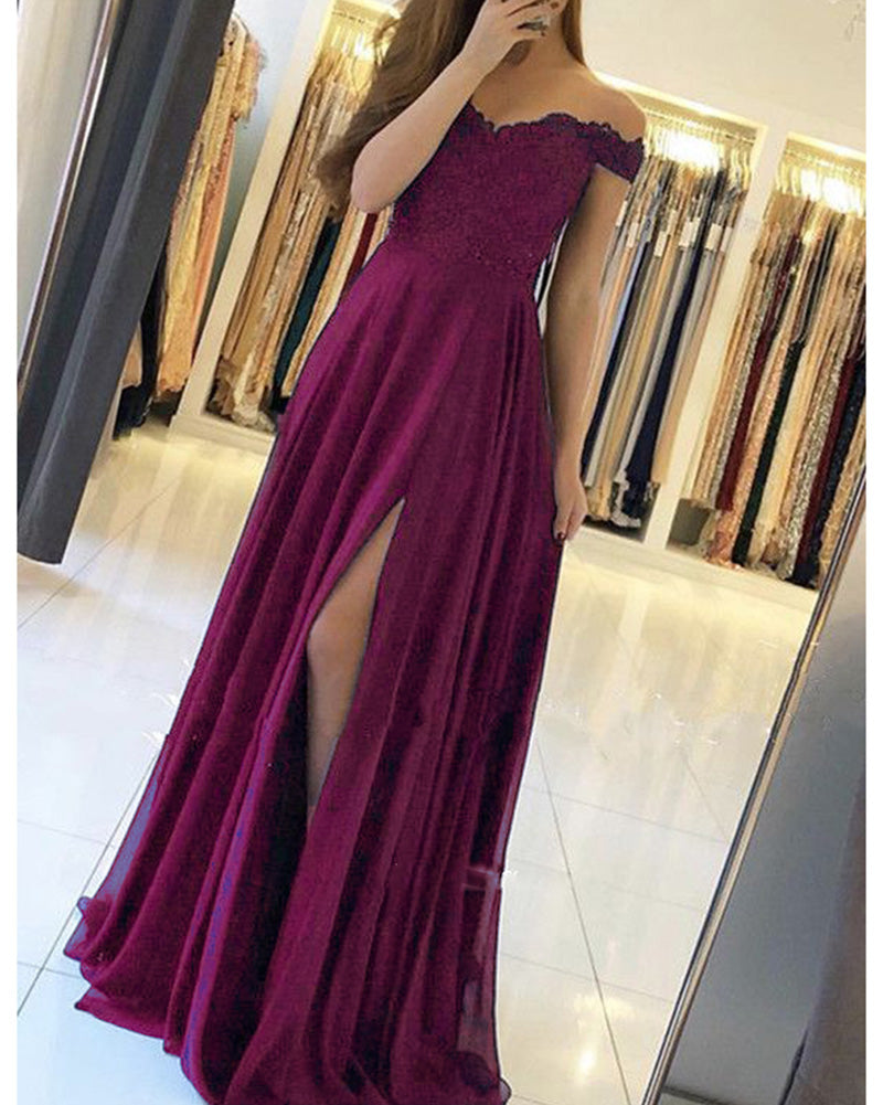 Elegante vestido de fiesta largo con apliques de encaje y hombros descubiertos para niñas con abertura sexy PL0011