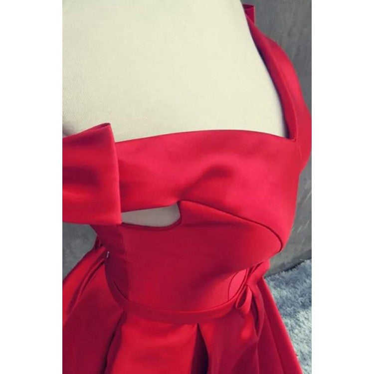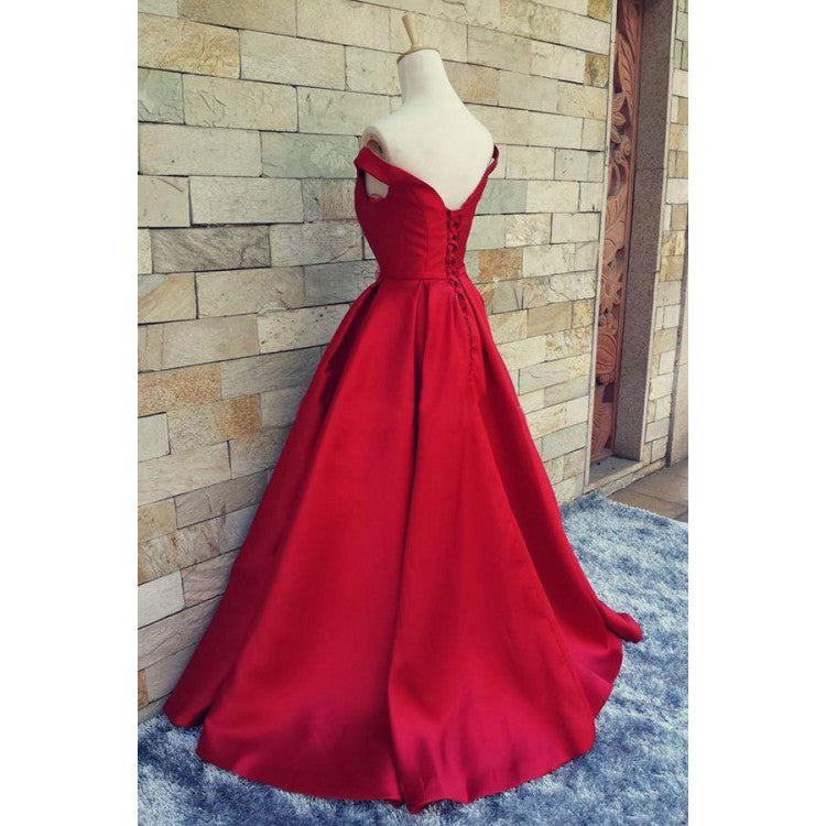 Elegante vestido de fiesta rojo de satén con hombros descubiertos y corte en A, vestido formal largo, vestido de fiesta LP719