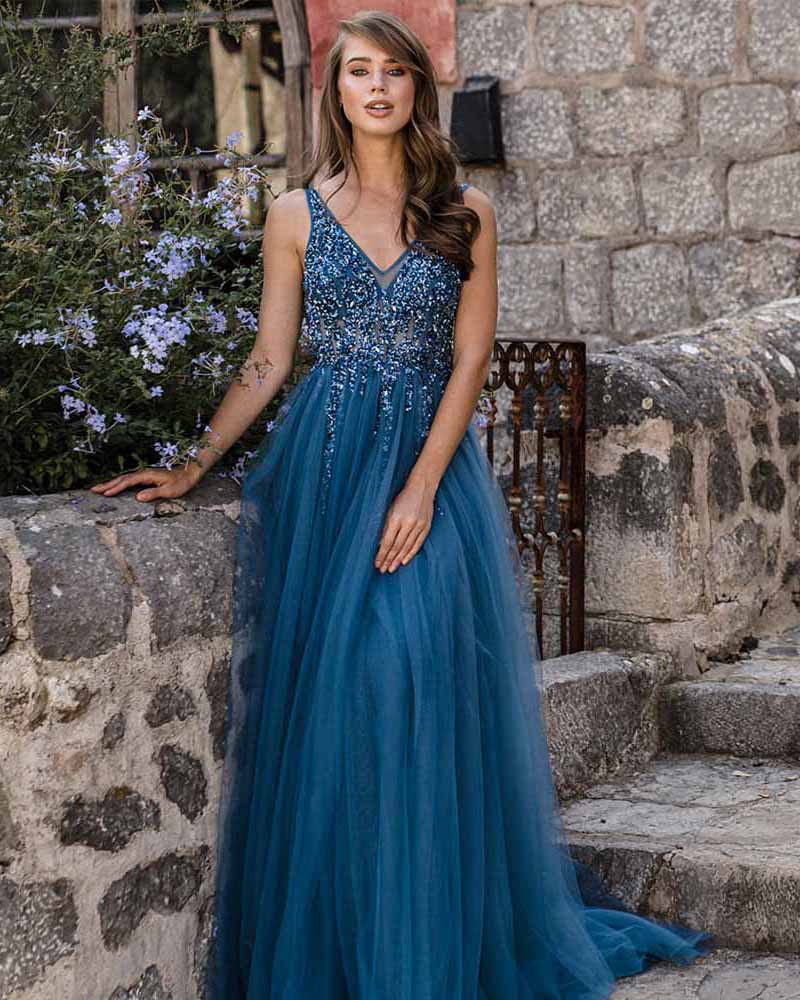 Elegante vestido largo de noche con escote en V y cuentas, vestido de fiesta, vestido de fiesta azul para niñas PL10504