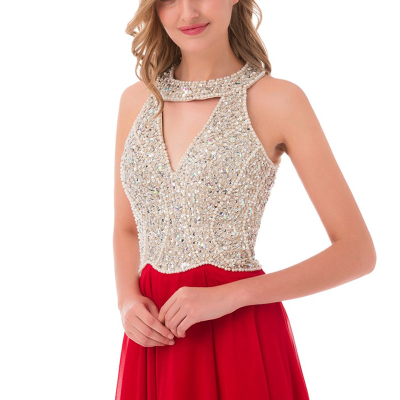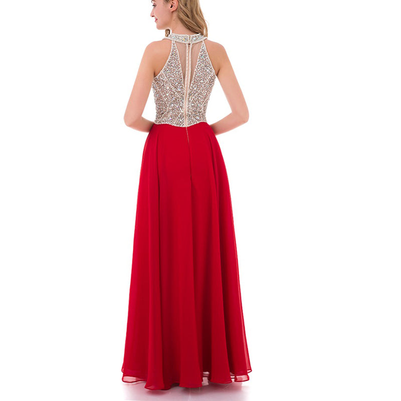 Vestido de fiesta de graduación largo rojo con cuello halter y cuentas a la moda para niñas LP0594