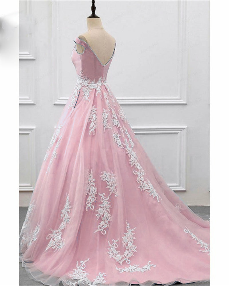 Vestido de fiesta formal de encaje con hombros descubiertos en color rosa marfil, vestido de quinceañera, vestido de novia PL10902