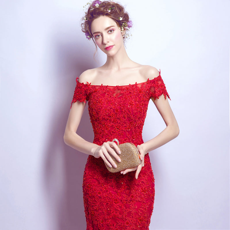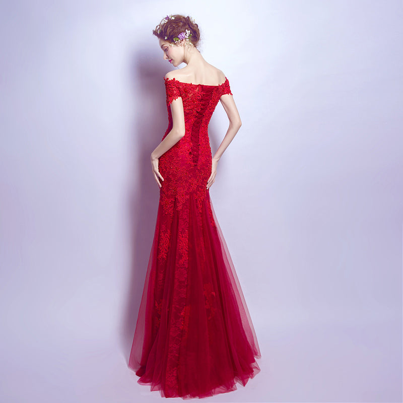 Vestido de fiesta formal de sirena con hombros descubiertos y manga corta de encaje rojo