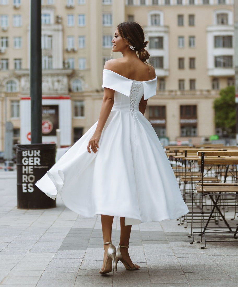 Vestido de novia de verano con hombros descubiertos, corto, de satén blanco, hasta la rodilla SW10502