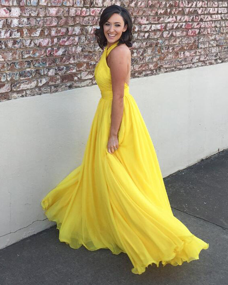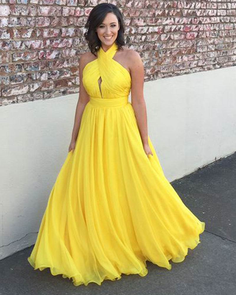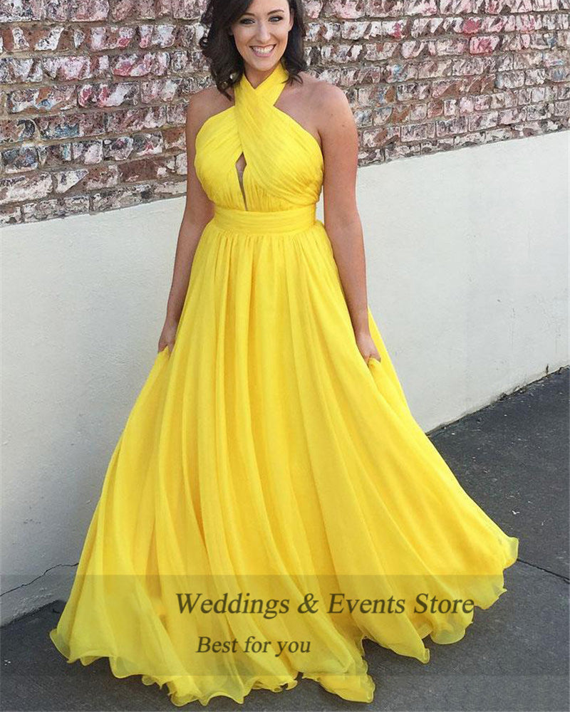 Impresionantes vestidos de fiesta formales de gasa amarilla brillante con cuello halter largo para mujer PL10102