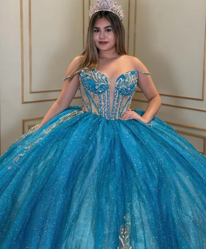 Off the Shoulder Blue Ball Gown Quinceneara Dress Gold Appliques Corest Birthday Party Dresses Vestidos De15 Anos Vestido Customized PL11052