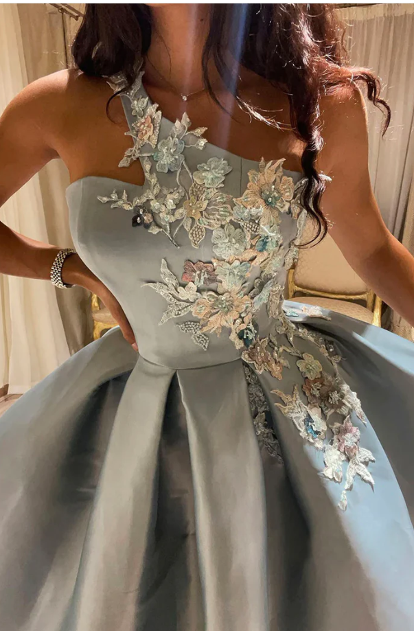 Vestido de fiesta azul cielo con hombros descubiertos, vestidos formales con flores hechas a mano