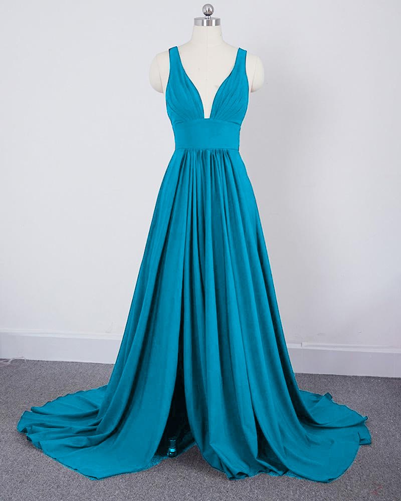 Vestido de fiesta largo rojo con abertura en la pierna y escote en V profundo LP641