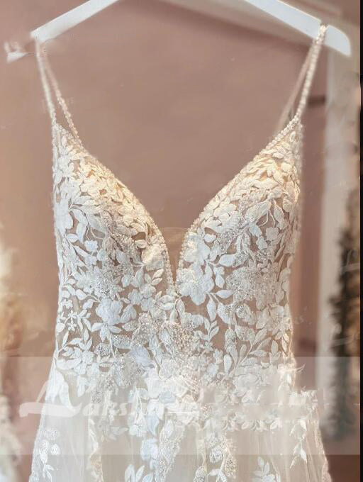 Vestidos de novia de encaje sexys con tirantes finos y corte A para mujer WD4713