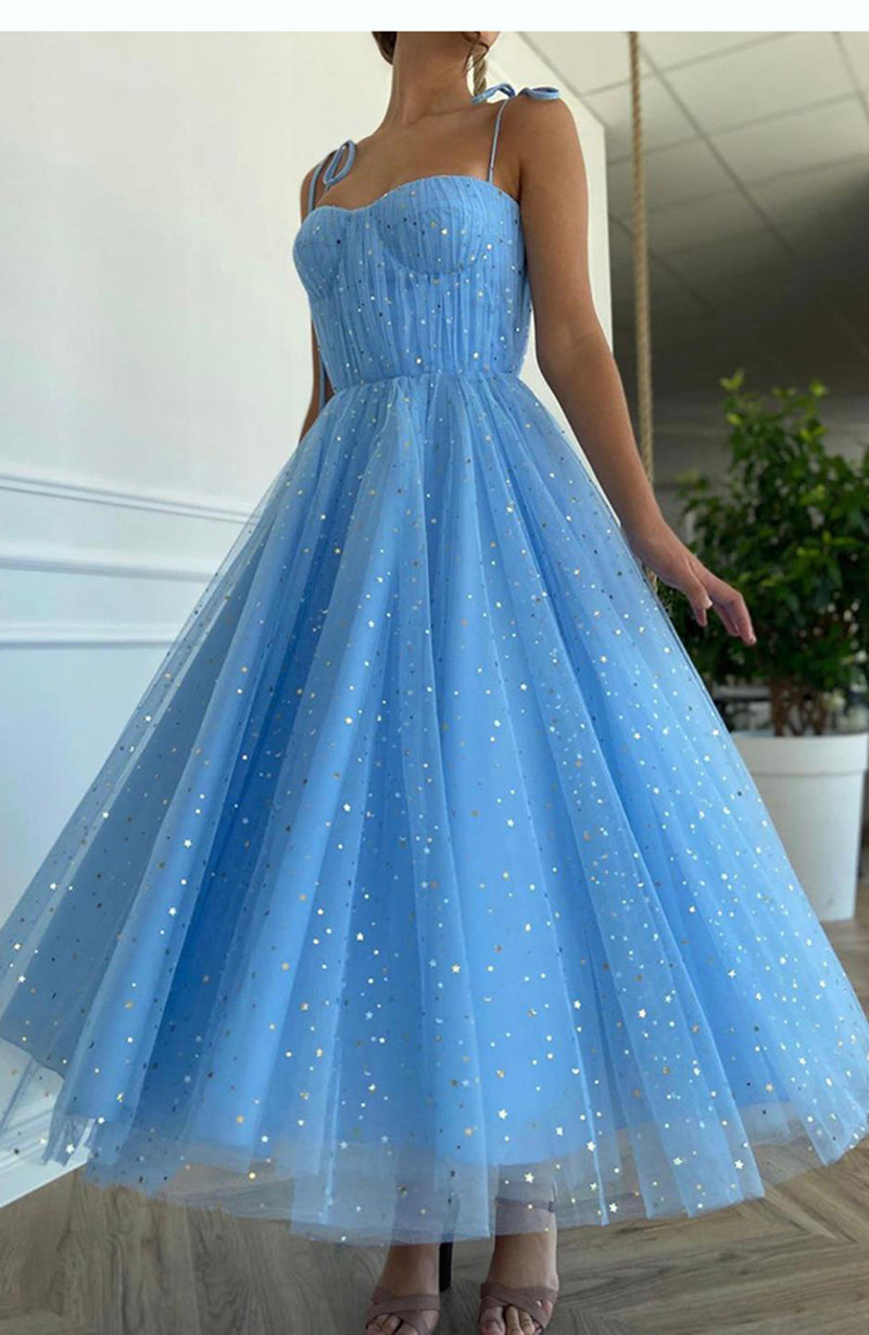 Vestidos de fiesta para niñas en azul hielo con largo hasta la rodilla y destellos de los años 50 PL10423