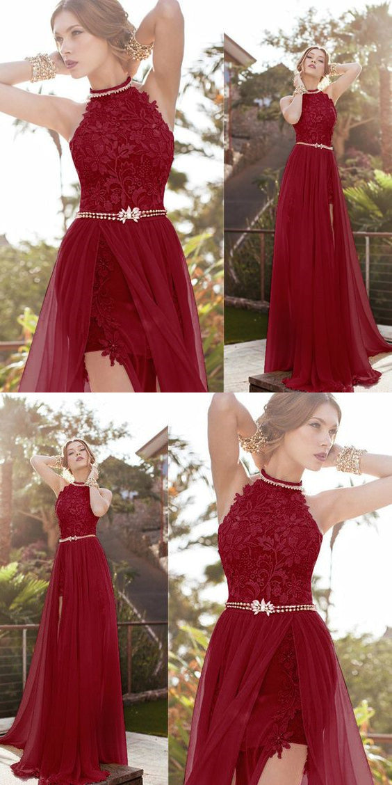 Vestido de noche largo de encaje con cuello halter color burdeos, vestido de fiesta formal con abertura sexy LP0280