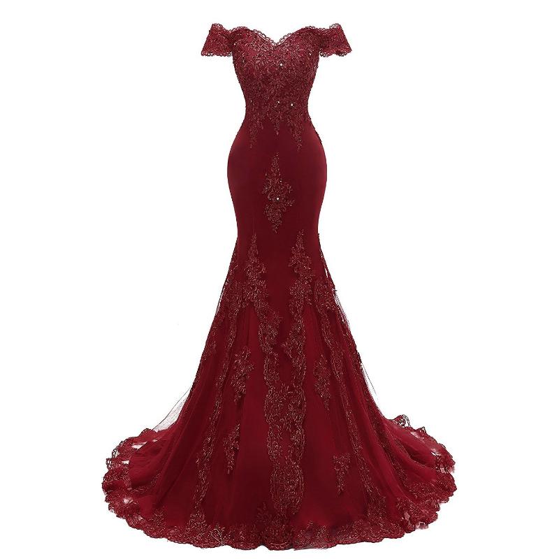 Vestido de fiesta de encaje burdeos, sirena, hombros descubiertos, vestido formal de noche largo LP2301