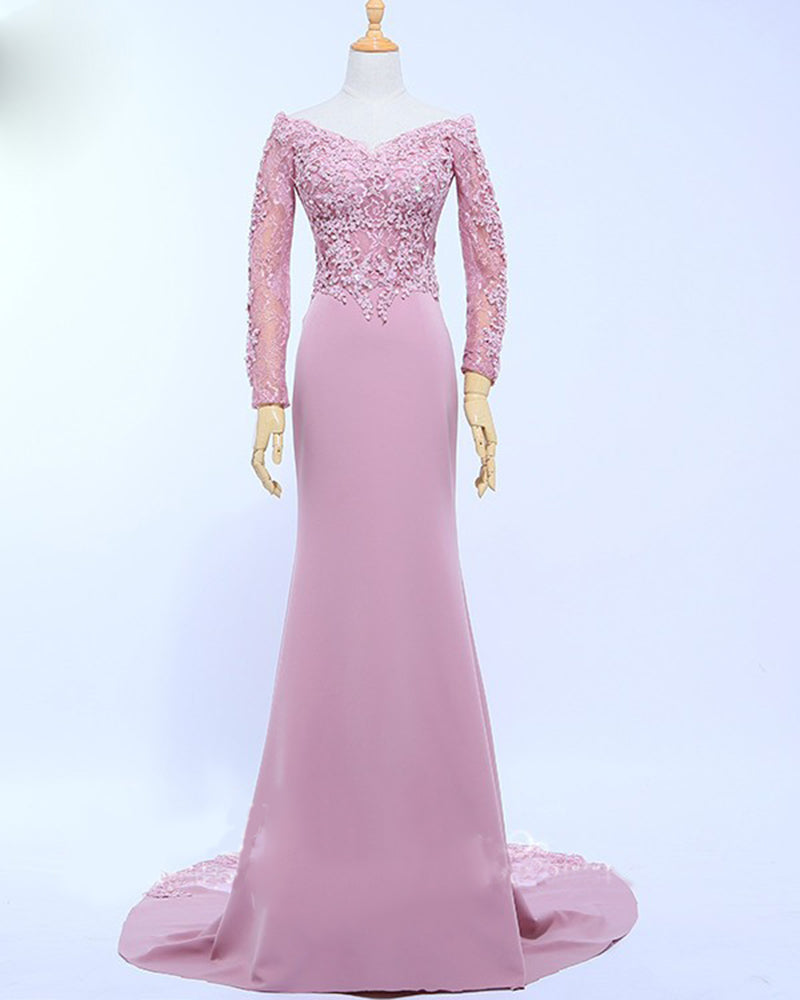 Vestido de dama de honor de manga larga color burdeos con adornos de encaje para mujer, vestido formal de fiesta de noche LP6621