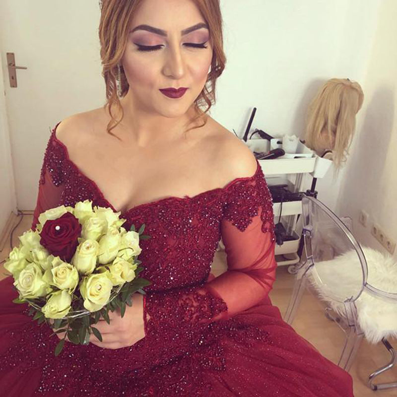 Vestido de novia de princesa con hombros descubiertos y encaje color burdeos, con mangas, MO002
