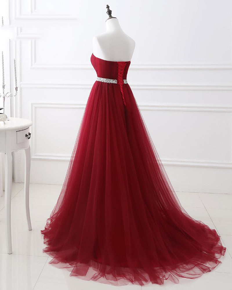 Vestido de fiesta de tul con cinturón de cuentas y escote en forma de corazón en color rojo burdeos WL212