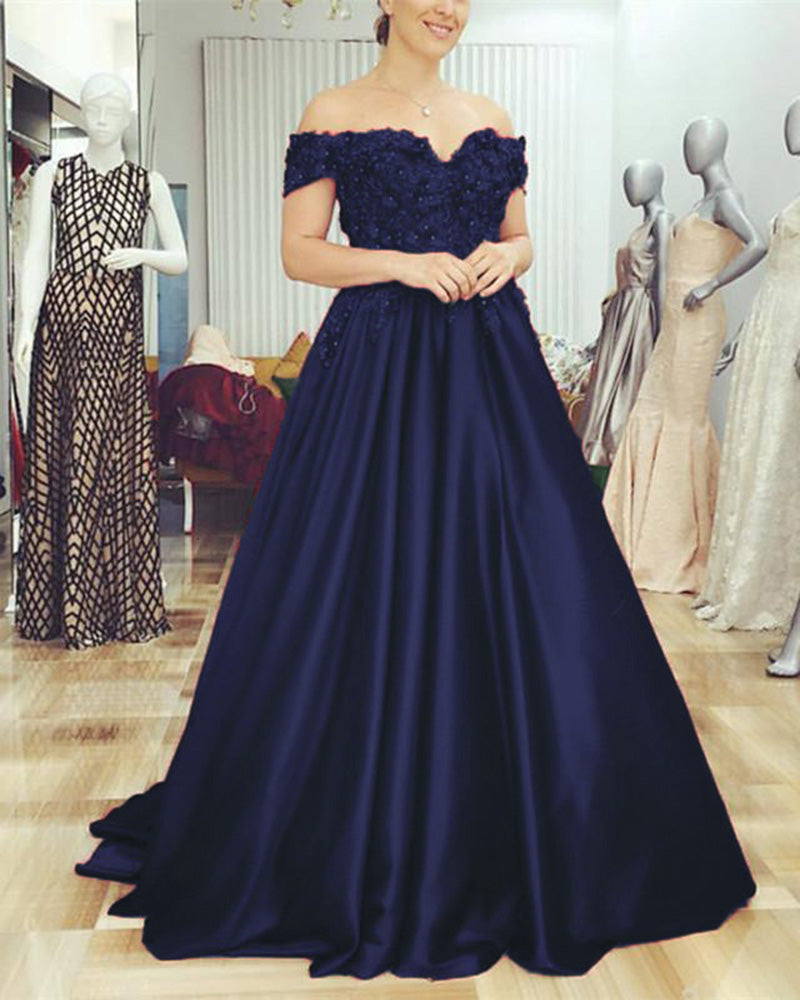 Vestido de novia burdeos de satén con hombros descubiertos y flores de encaje LP6632