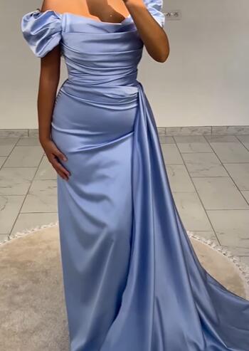Vestidos de noche largos de satén con abertura y mangas cortas y cuentas en forma de A en color azul PL0901