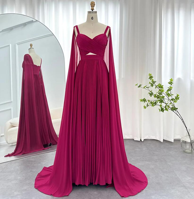 Vestido de noche largo formal para mujer color burdeos con mangas estilo capa PL12243
