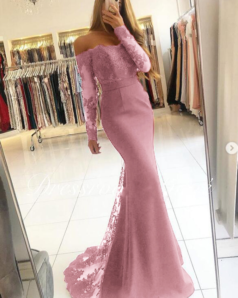 Vestidos de fiesta de noche de sirena con encaje y mangas largas color burdeos/azul para mujer PL2145