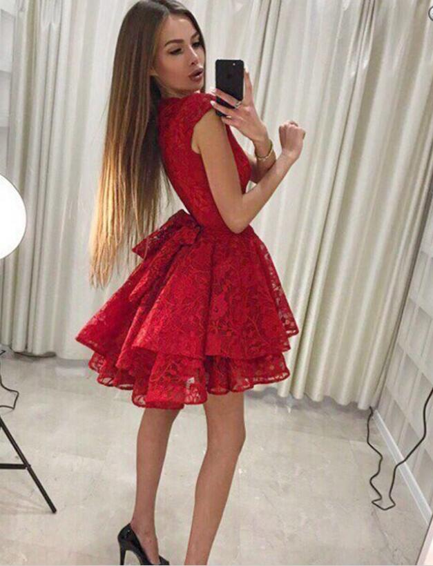 Vestido de fiesta corto de encaje con escote redondo y mangas cortas modestas para jóvenes 2020 SP402