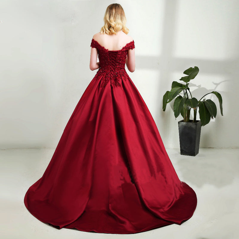 Vestido de fiesta de satén con encaje y hombros descubiertos en azul marino/burdeos, vestido de compromiso para boda LP0512