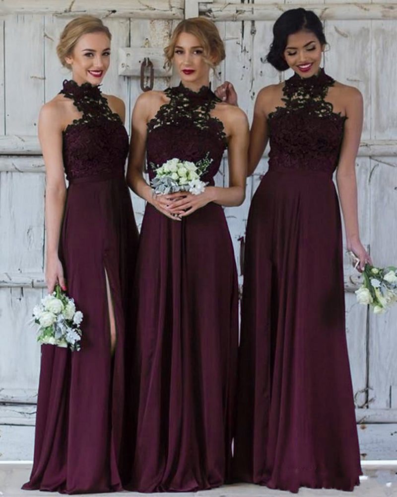 Vestido largo de gasa con cuello halter y encaje azul marino/burdeos para dama de honor, vestido de fiesta de boda para mujer PL0908