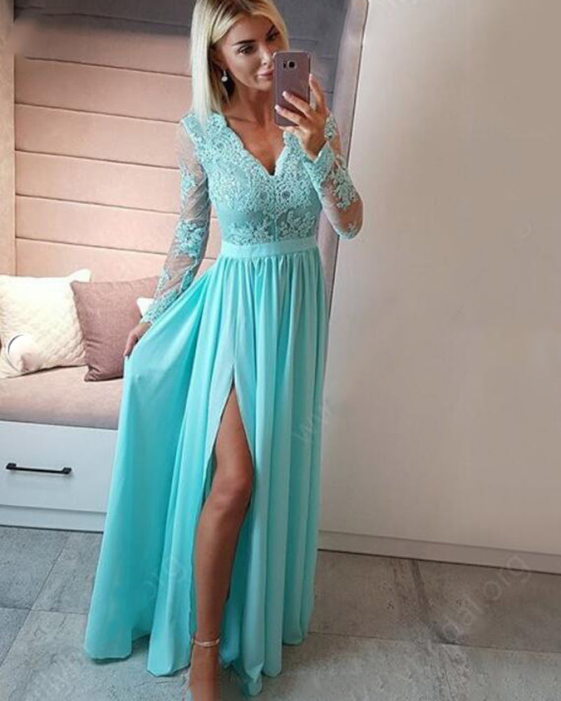 Vestido de fiesta formal de gasa con encaje y mangas largas, estilo vintage, multicolor, largo hasta el suelo, con abertura PL10275