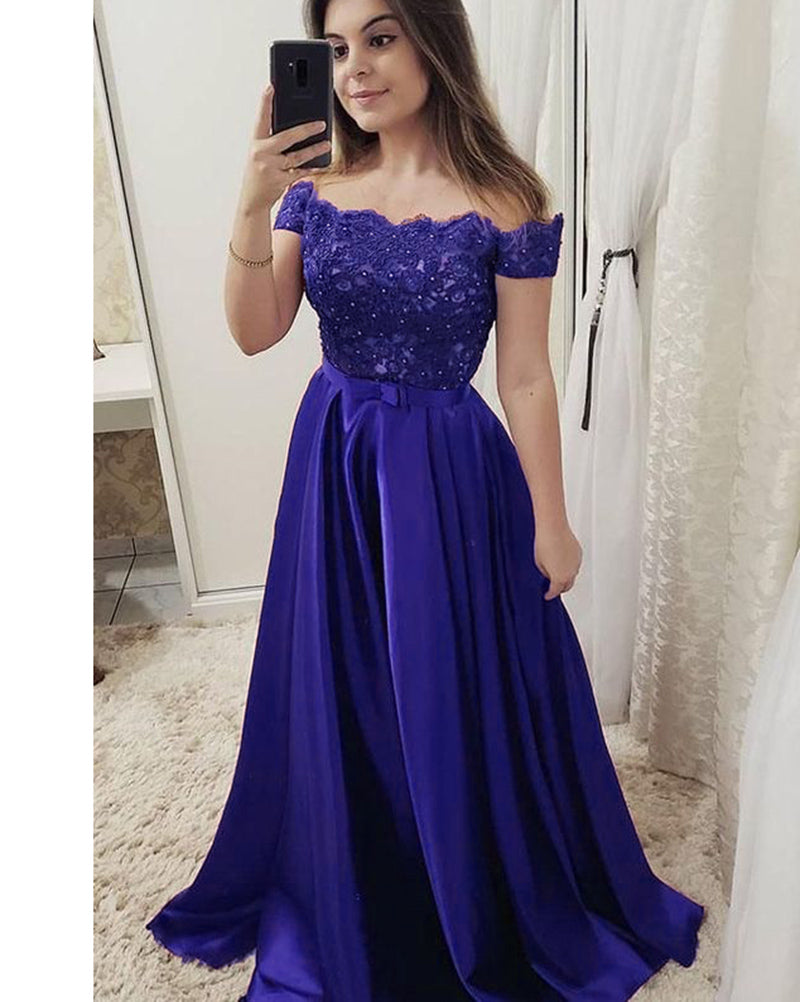 Vestido de fiesta elegante con hombros descubiertos y apliques de encaje largo en azul marino, verde y rojo PL2577
