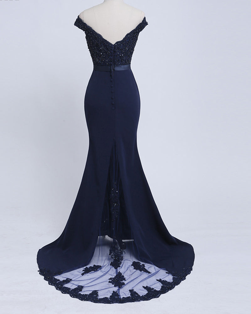 Vestido largo de tul con hombros descubiertos para mujer, vestido de fiesta de noche azul marino LP554