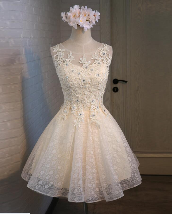 Nuevo vestido de fiesta corto de encaje beige para niñas pequeñas, vestido de graduación para adolescentes SP10223