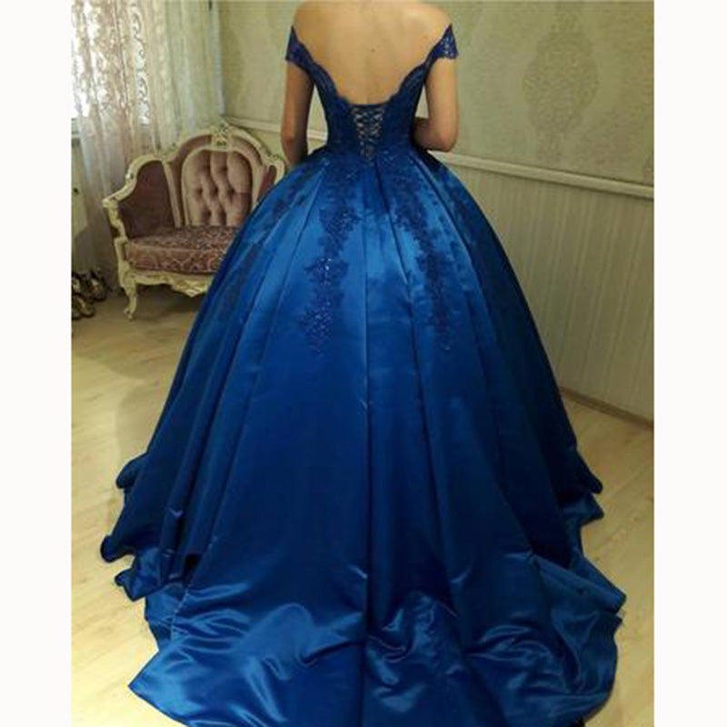 Vestido de fiesta con hombros descubiertos, vestido de novia azul satinado, vestido formal con encaje para fiesta de graduación 2018