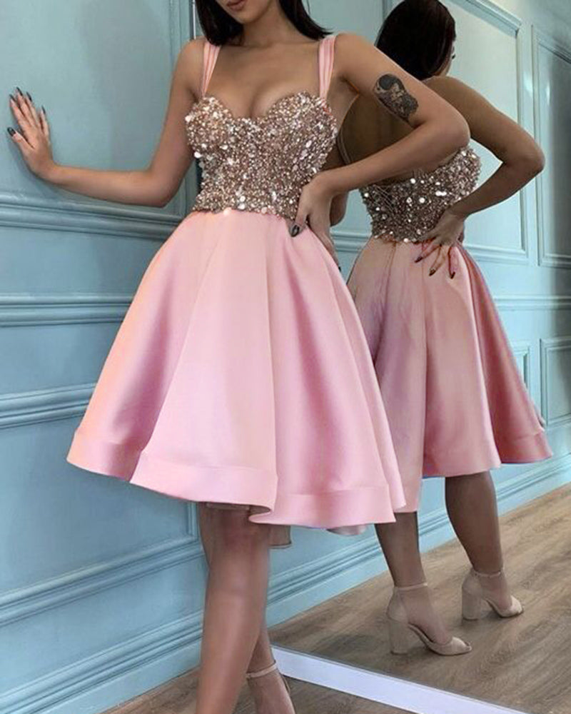 Vestido de fiesta corto hasta la rodilla en color rosa/azul con tirantes y lentejuelas y abalorios, vestido de fiesta de bienvenida para niñas de octavo grado SP01113