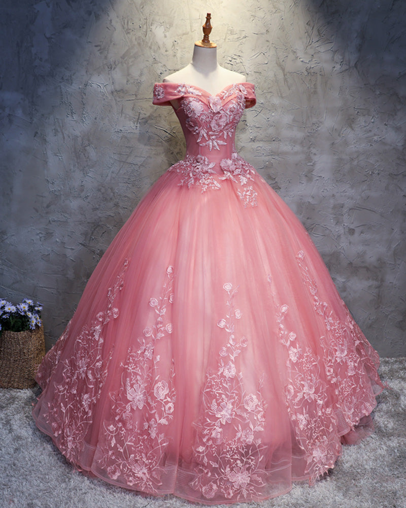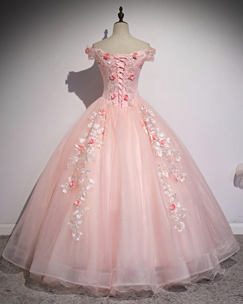 Vestido de fiesta con encaje y flores en color rosa con hombros descubiertos para quinceañeras de 15/16 años