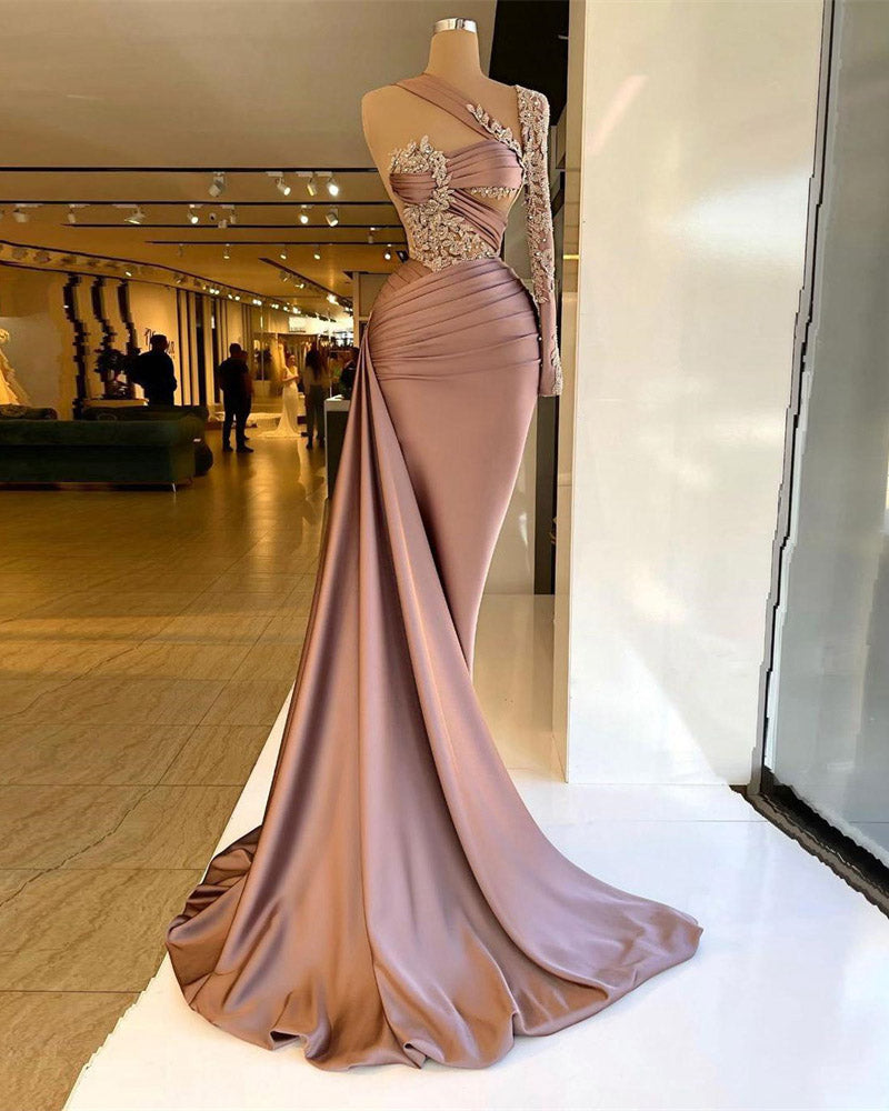Vestido de noche con cola de pez y encaje con hombros descubiertos en color rosa