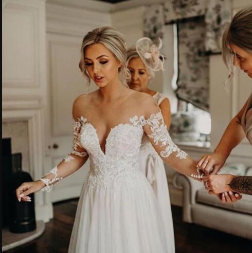 Vestido de novia romántico de tul con encaje y mangas largas en forma de A WD0719